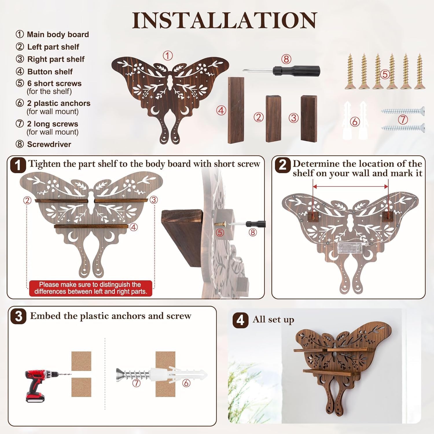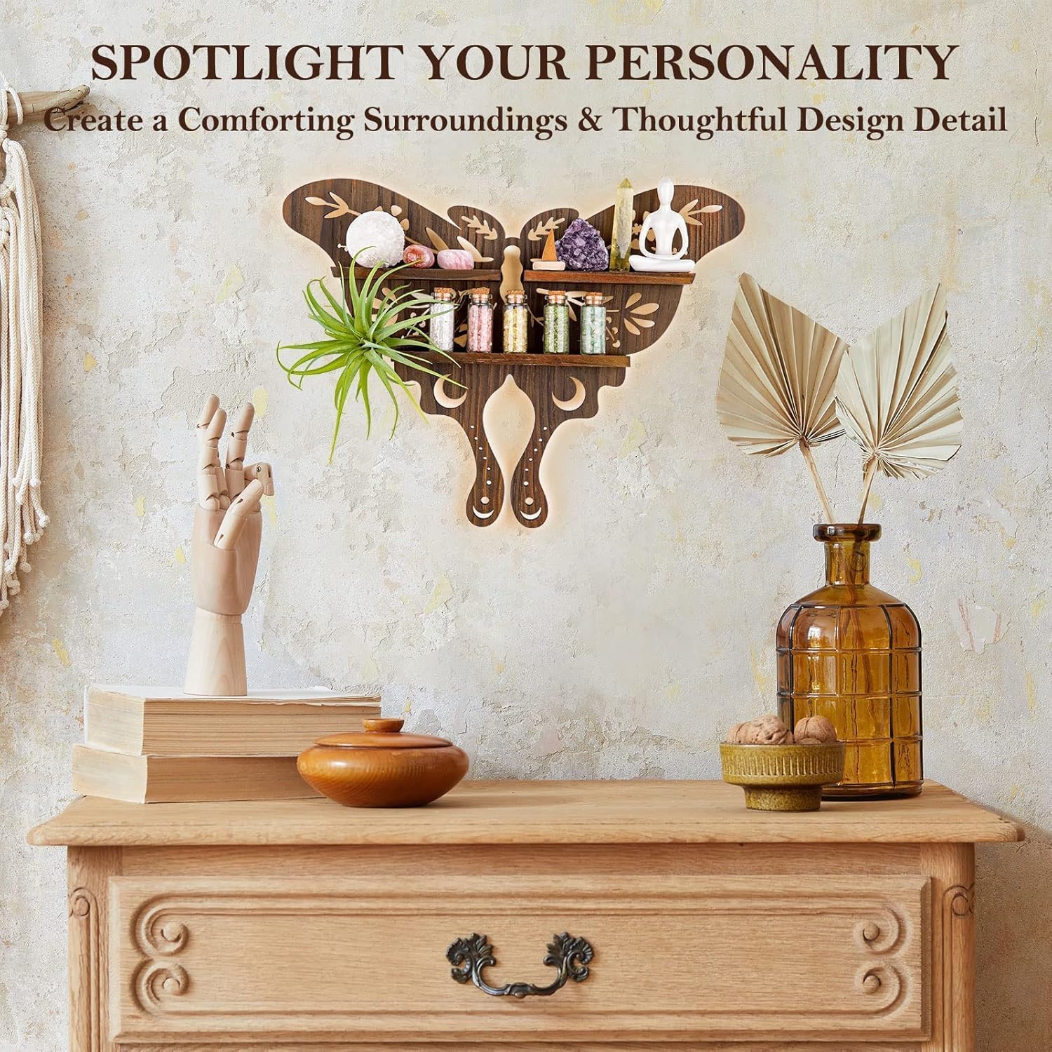 🎁Curate your personal haven: its dual-tiered shelves cradle crystals, mini plants, or cherished keepsakes 🪴, while the butterfly’s delicate cutouts add airy, organic texture. It’s not a shelf—it’s a canvas for your personality, wrapped in timeless wood grain.