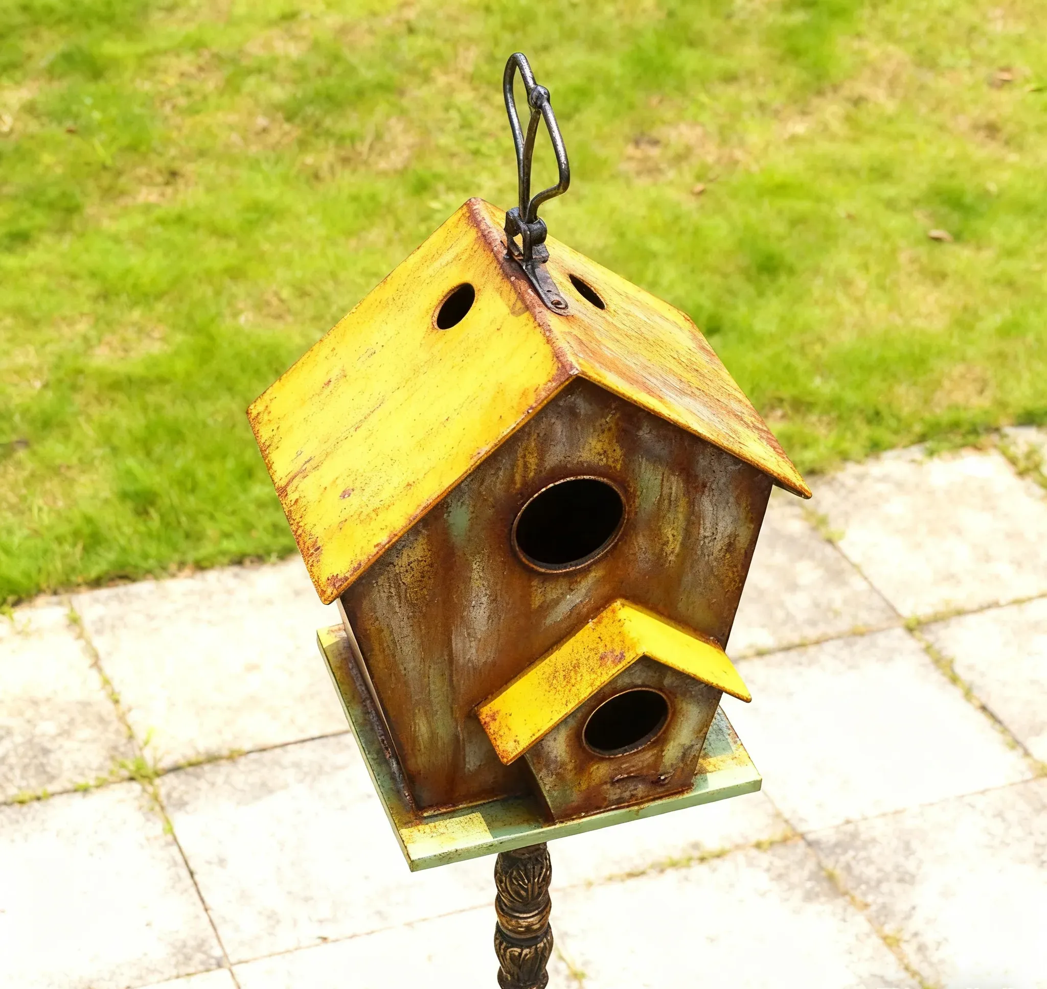 This birdhouse ornament is a delightful surprise in urban green spaces! Its vintage, weathered appearance, paired with a striking yellow roof, adds a distinctive artistic touch when placed on lawns or in gardens. It instantly elevates ordinary outdoor areas with style, transforming them into eye-catching little scenes.