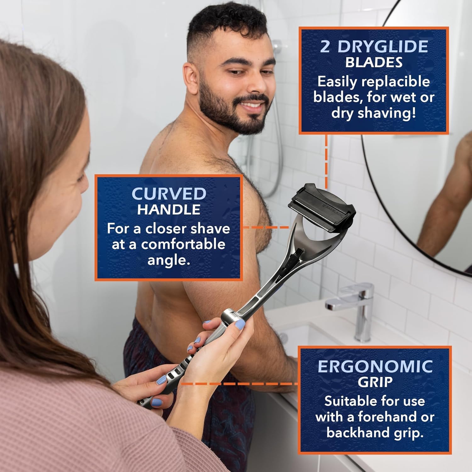 Unlock the Luxury Experience: The Premium Back Shaver Set includes a hook, cleaning brush, and four DryGlide blades, all meticulously designed for long-lasting durability. From the sleek metal finish to the precise mechanics, every component exudes quality—an investment in exceptional personal care that lasts.