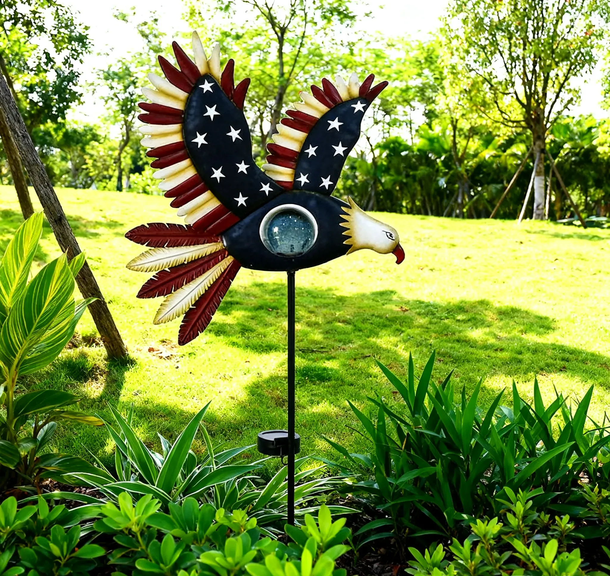 Featuring the silhouette of a bald eagle, with elements of the American flag incorporated into its wings and plumage. The red and white feathers, adorned with star-shaped accents, exude an American aesthetic and artistic flair. Its winged posture radiates dynamism and vitality, adding a distinctive visual focal point to any garden.