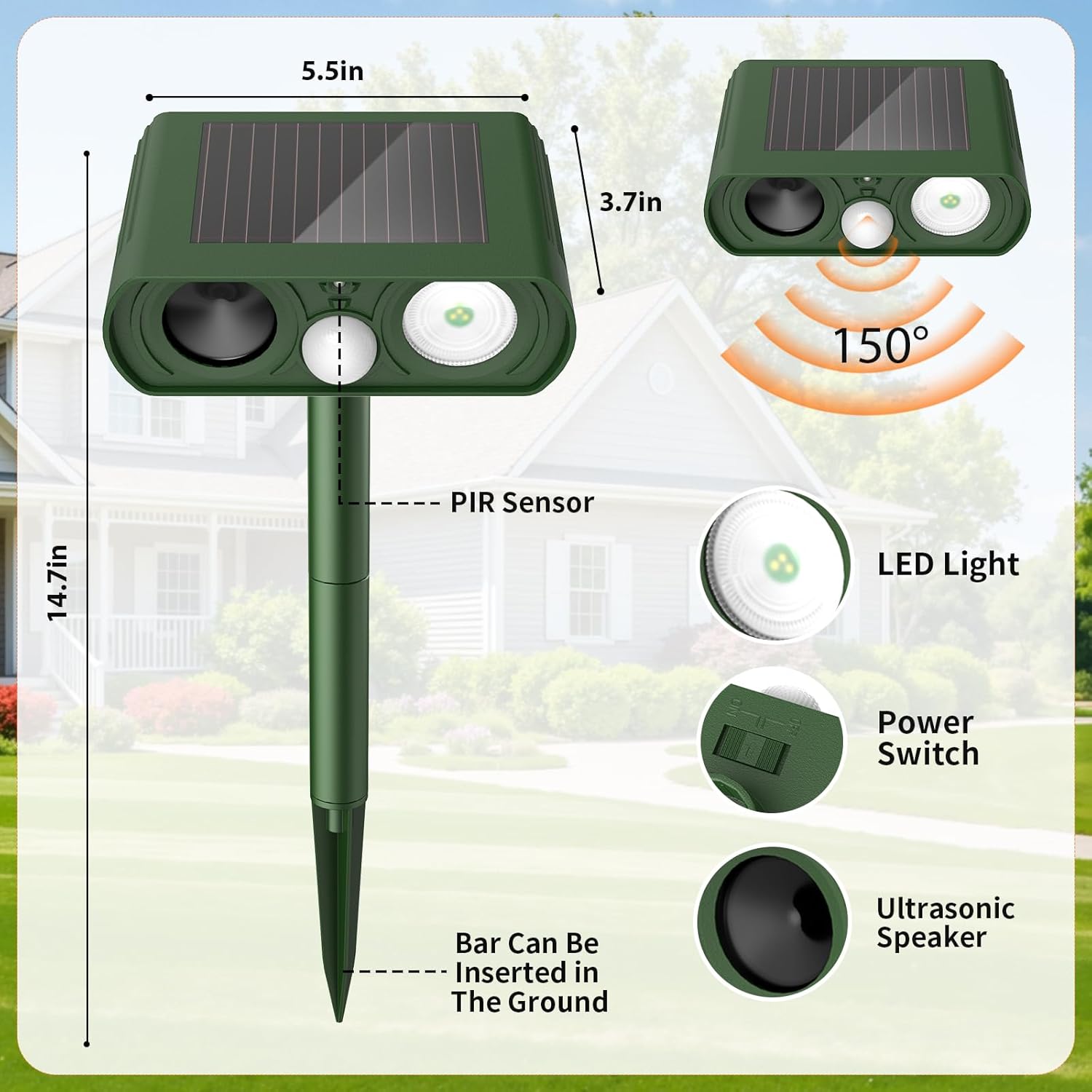 Enhance the safety of your outdoor spaces with our powerful animal repellent. A masterpiece of humane repellency, this repellent uses sound waves and a high-brightness LED light to effectively deter a variety of animals within a 30-foot radius and a 150° detection angle, from deer and raccoons to birds and foxes. More than just a repellent, it's a guardian of your garden's tranquility, ensuring unwelcome guests don't disturb your outdoor paradise.